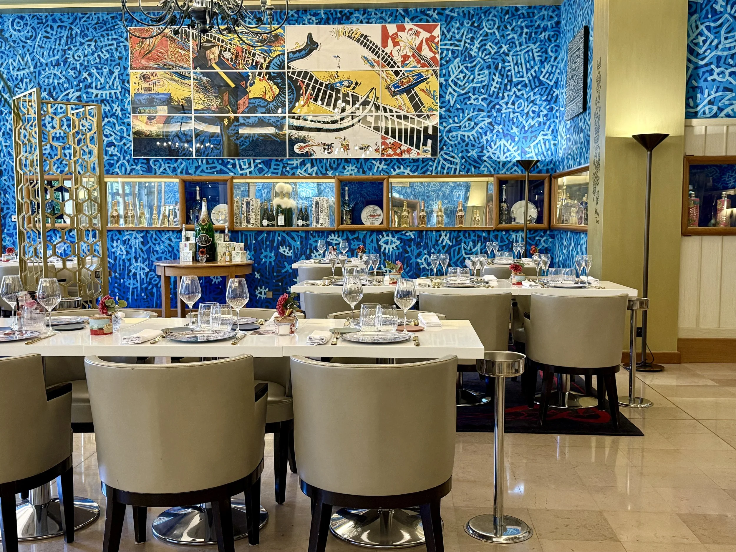 After spending the morning at Maison Ruinart, wandering through its quiet, chalk-lined cellars and tasting an incredible pair of Blanc de Blancs, a short six-minute stroll leads you to Le Réfectoire at Vranken-Pommery, the ideal setting to continue the Champagne reveire. Once the estate's original refectory, this art-filled brasserie has been transformed into a modern ode to French style. Bathed in Pommery’s signature blue and dotted with contemporary pieces, it perfectly bridges Reims’ deep-rooted heritage with its creative, forward-looking spirit.