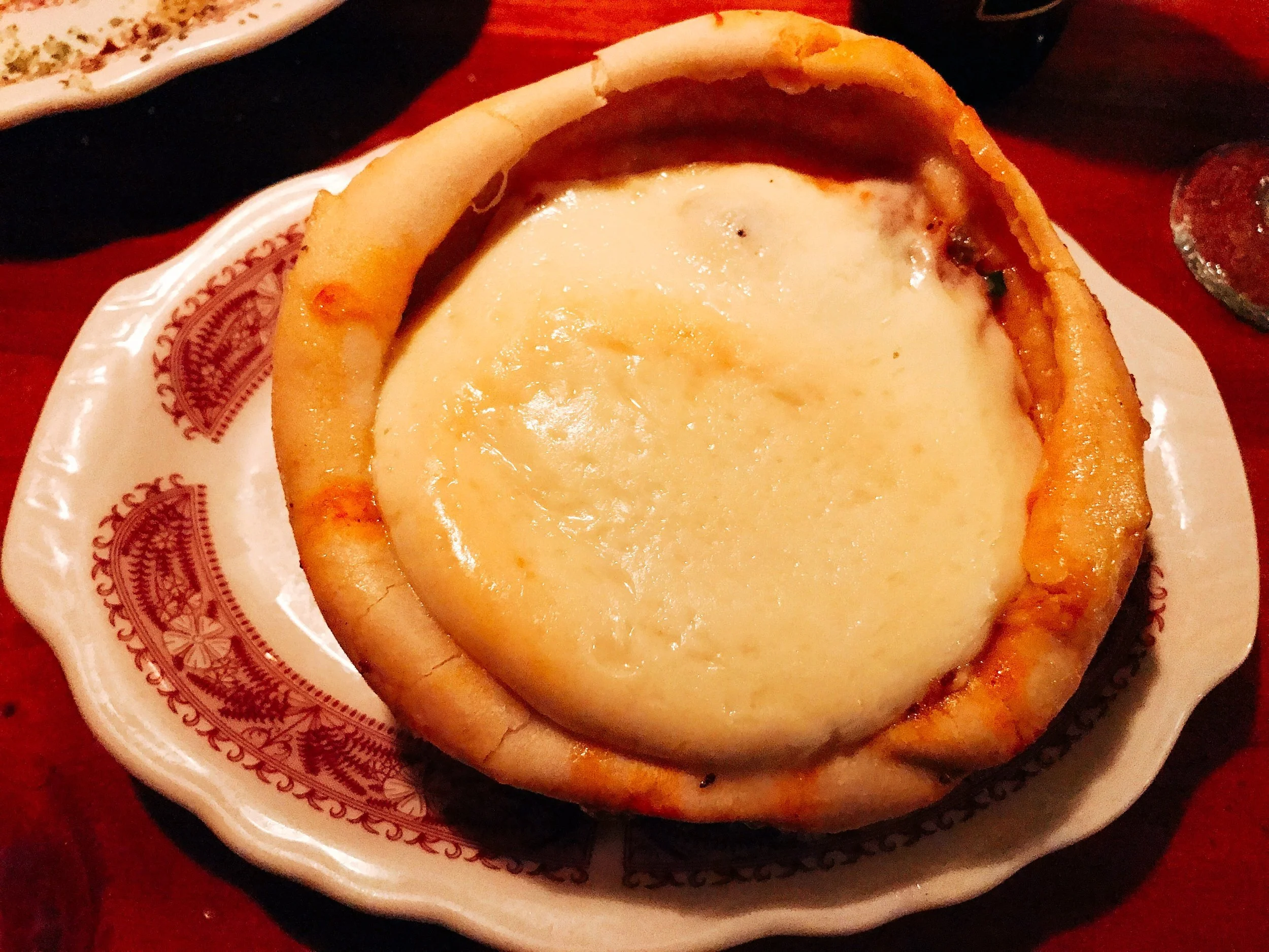 You may be thinking "didn't you just say you were starving? This looks a little small." Chicago Pizza and Oven Grinder Company offer two sizes for their pizza pot pies: the Half-Pounder and the One-Pounder. Featured above is the half-pounder and rest assured that is plenty for one person.