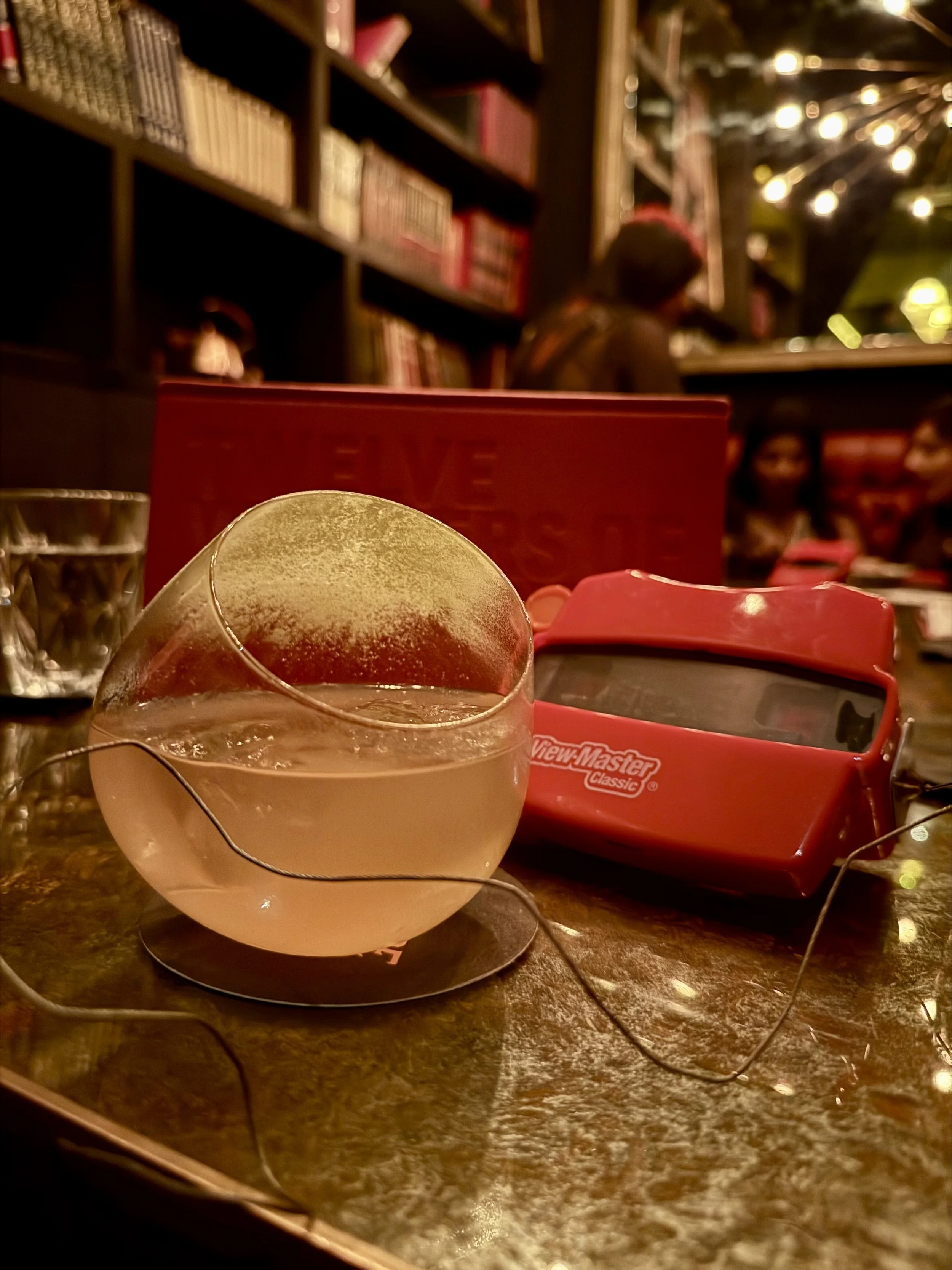 Guests are given a menu and an old-school Viewmaster to peruse before they order. I ordered the Thalassaki, which is a cocktail from Greece featuring Altos Plata tequila infused with melon, lemon verbena, basil cordial, and herbal vinegar. It was quite an interesting drink.
