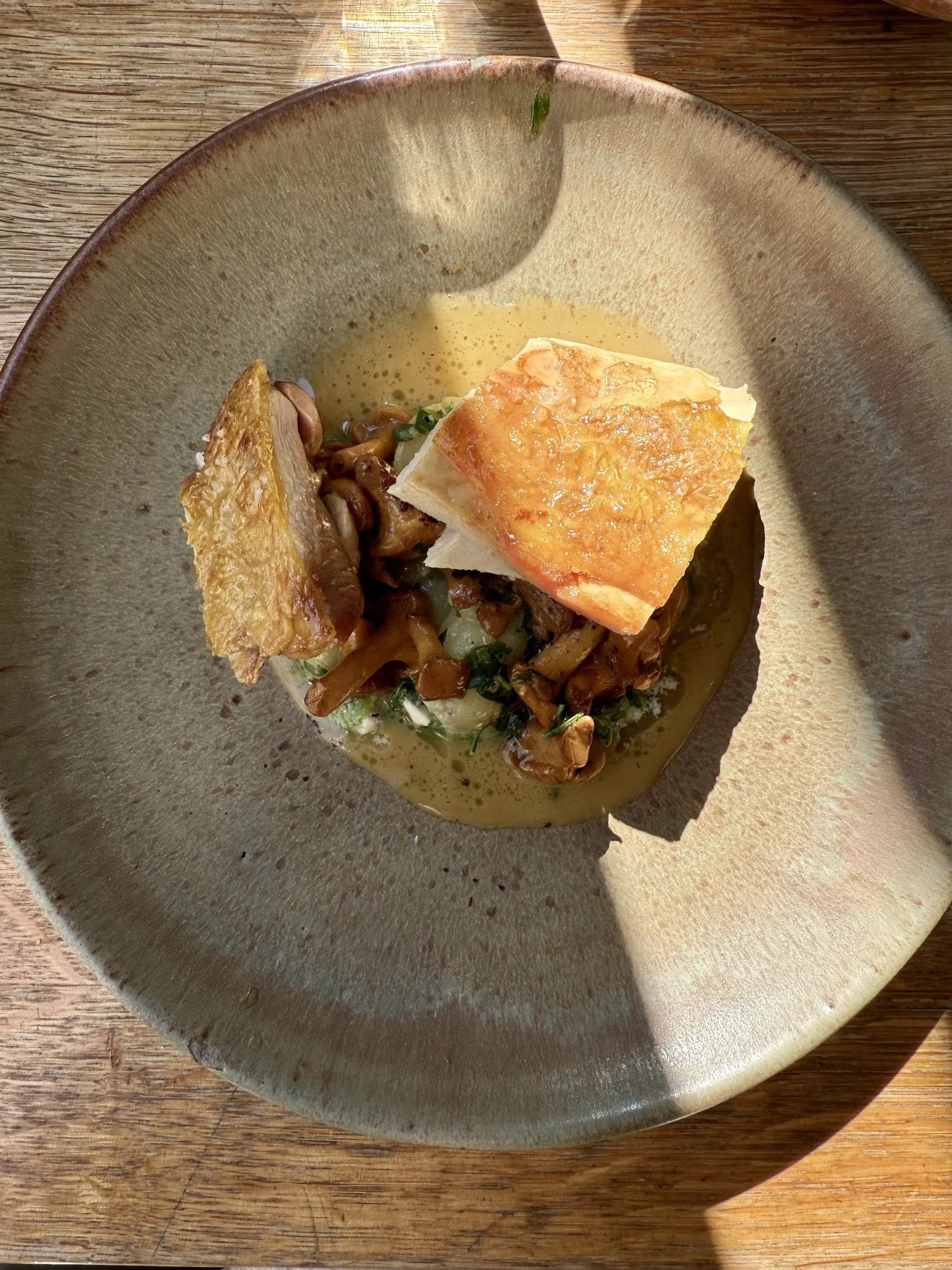 This dish beautifully exemplified Mokonuts’ style: simple, seasonal, and elegantly composed. A sunny egg yolk sits at the center, nestled in a creamy purée. Surrounding it are porcini mushrooms and fresh greens, topped with spices and a drizzle of olive oil. I was given this crusty, delicious bread to break the yolk and soak up every element of the dish.
