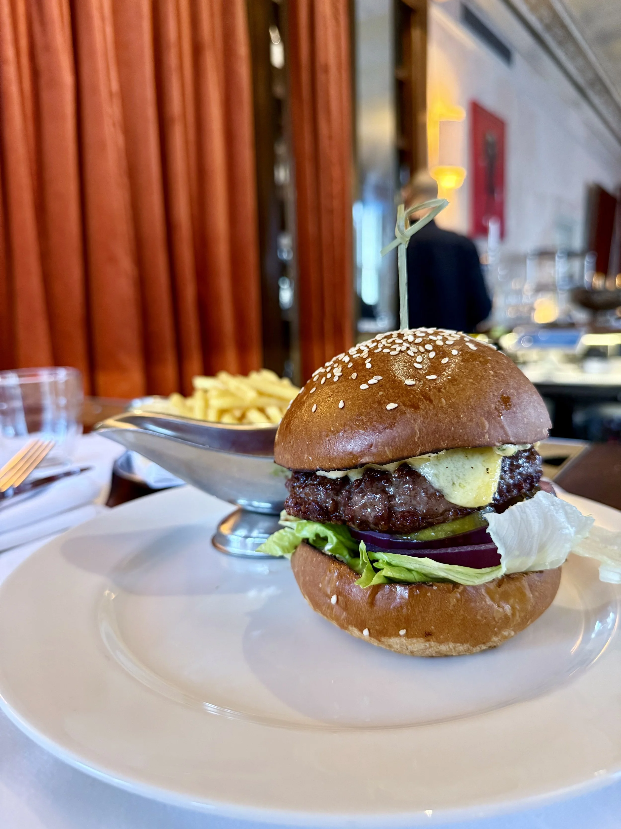 The One Club Row Cheeseburger “ Au Poivre: arrives without ceremony, just a perfect specimen on a plate, no architectural stacking, no unnecessary garnish, Medium-rare as requested, the patty thick enough to stay blushing pink at the center, topped simply with melted cheese, onion, and pickles.
