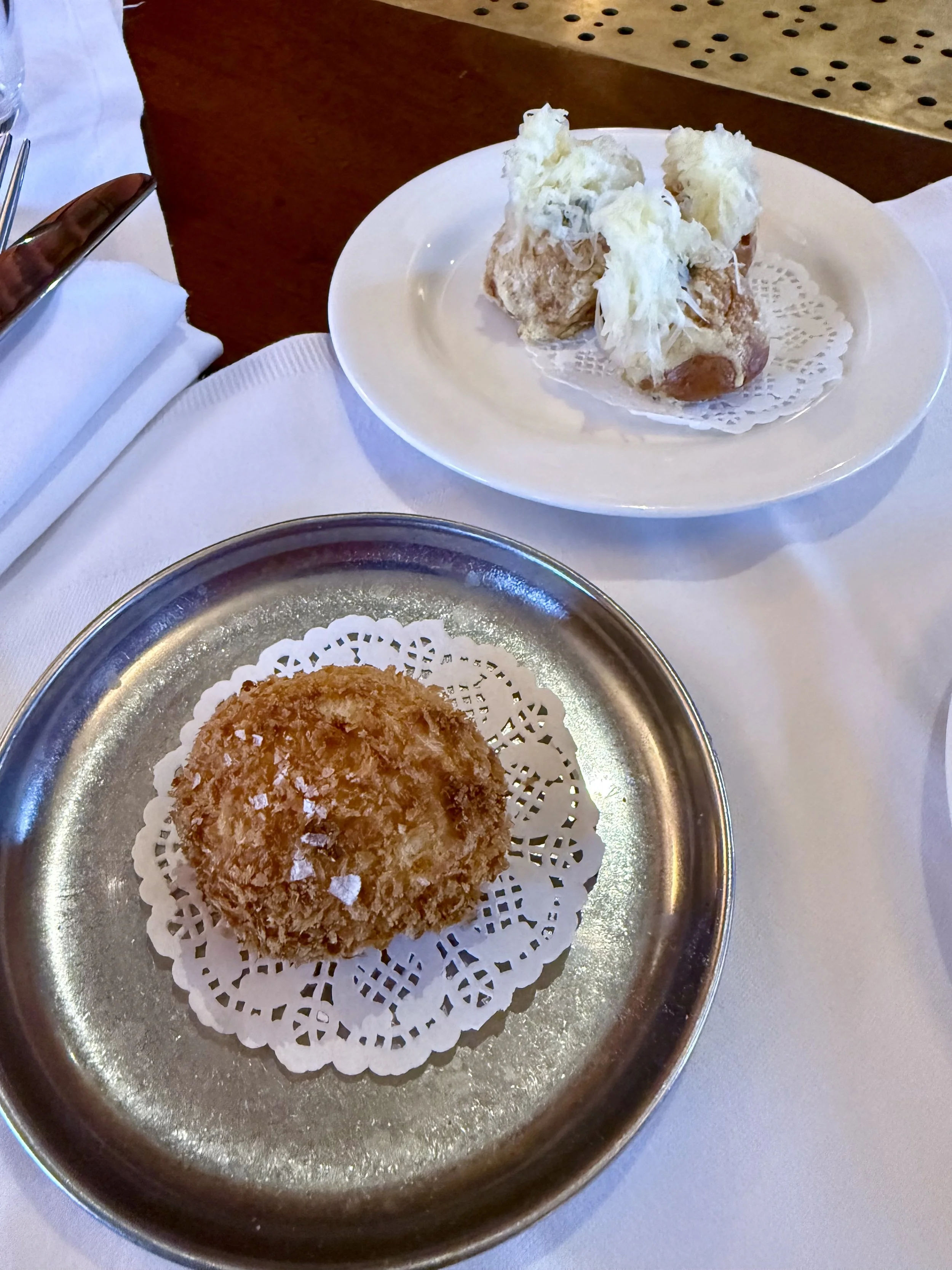 The Lobster + Country Ham Croquettes arrived first, golden, crisp-shelled, the kind of thing you order, thinking it will be refined and discover it’s actually just deeply, satisfyingly rich. But the Pickled Jalapeno Gougères stopped conversation entirely.