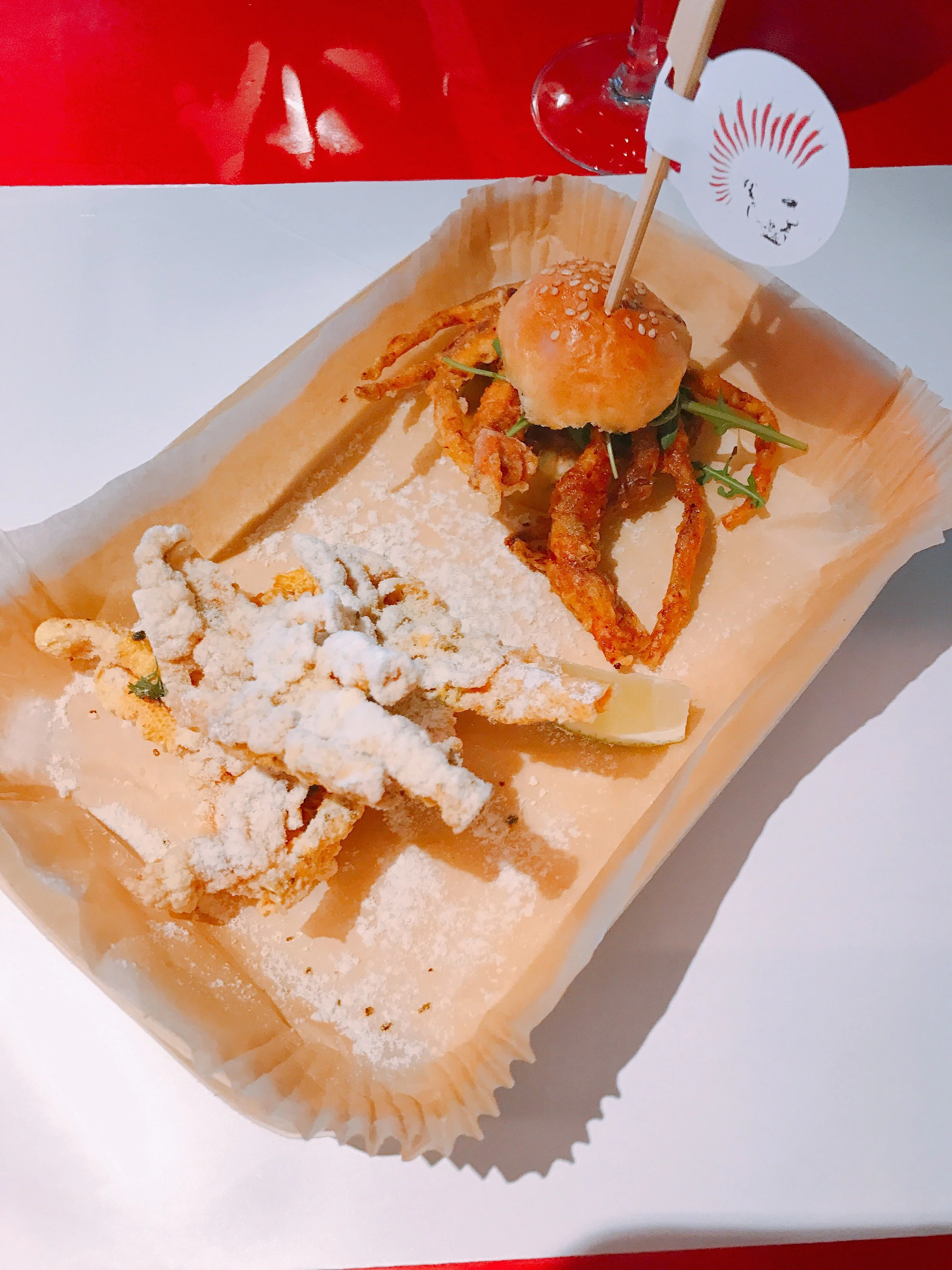 Even though I was satiated, I couldn't help it; I wanted one more course. Closing down the restaurant, Catarina brought over my final pairing: To drink: Acidulados to nosh: Crispy BurgerXO. The drink was stunning and a lovely way to finish off my meal. While I don't have all of the exact ingredients, it was sweet in flavor (almost strawberry tasting) with little pop rocks of chocolate placed on top. It reminded almost of a chocolate covered strawberry. The acidity paired perfectly with the dish. I had no idea what to expect when she brought over the Crispy BurgerXo, but thank goodness it was bite sized. A soft-shelled crab was placed on the smallest bun, allowing the legs to dangle over the side. What burger is served without a side of fries? While this one was served with something fried, it wasn't potatoes but rather fried chicken skin. The burger was to die for but to be honest, I wasn't a huge fan of the chicken skin. In theory, it's a fun idea, but probably my least favorite bite of the day.