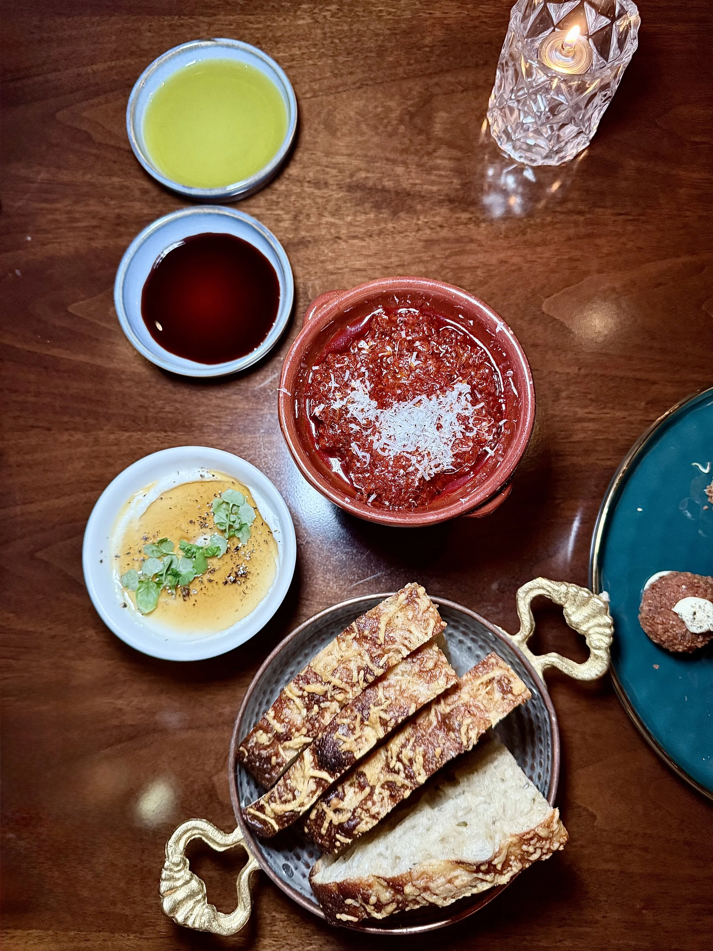 Yolan’s signature sourdough focaccia is baked fresh daily and served with a trio of spreads: whipped butter, whipped ricotta with fermented garlic honey ( yes, really), and warm ‘nduja. If you, like me, are always chasing “ the perfect bite,” try a smear of ricotta topped with a bit of ‘nduja. Trust me. It’s transcendent.